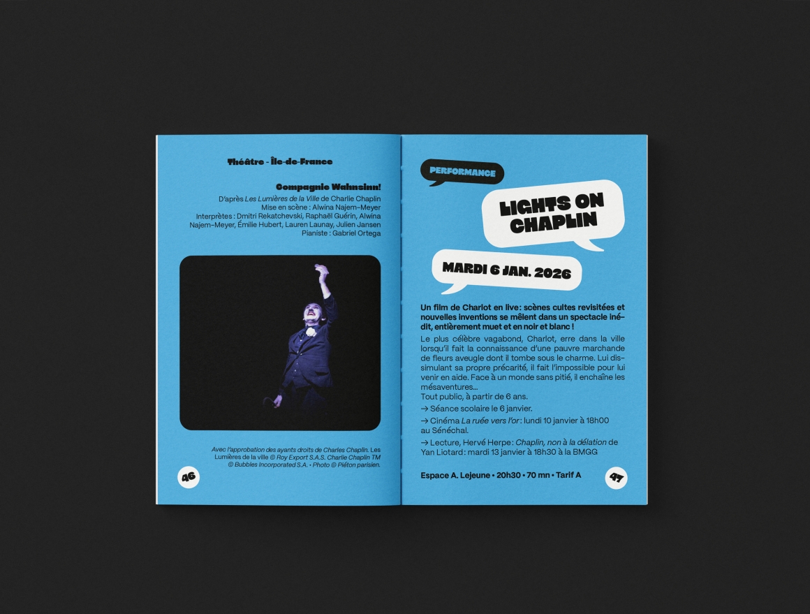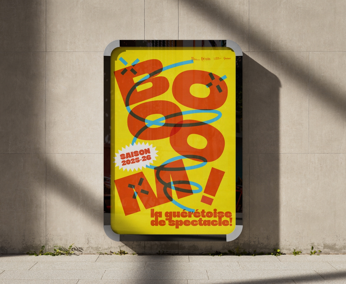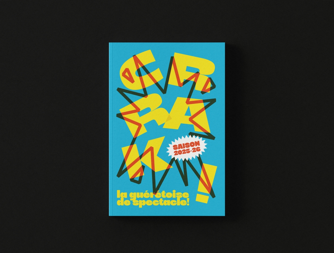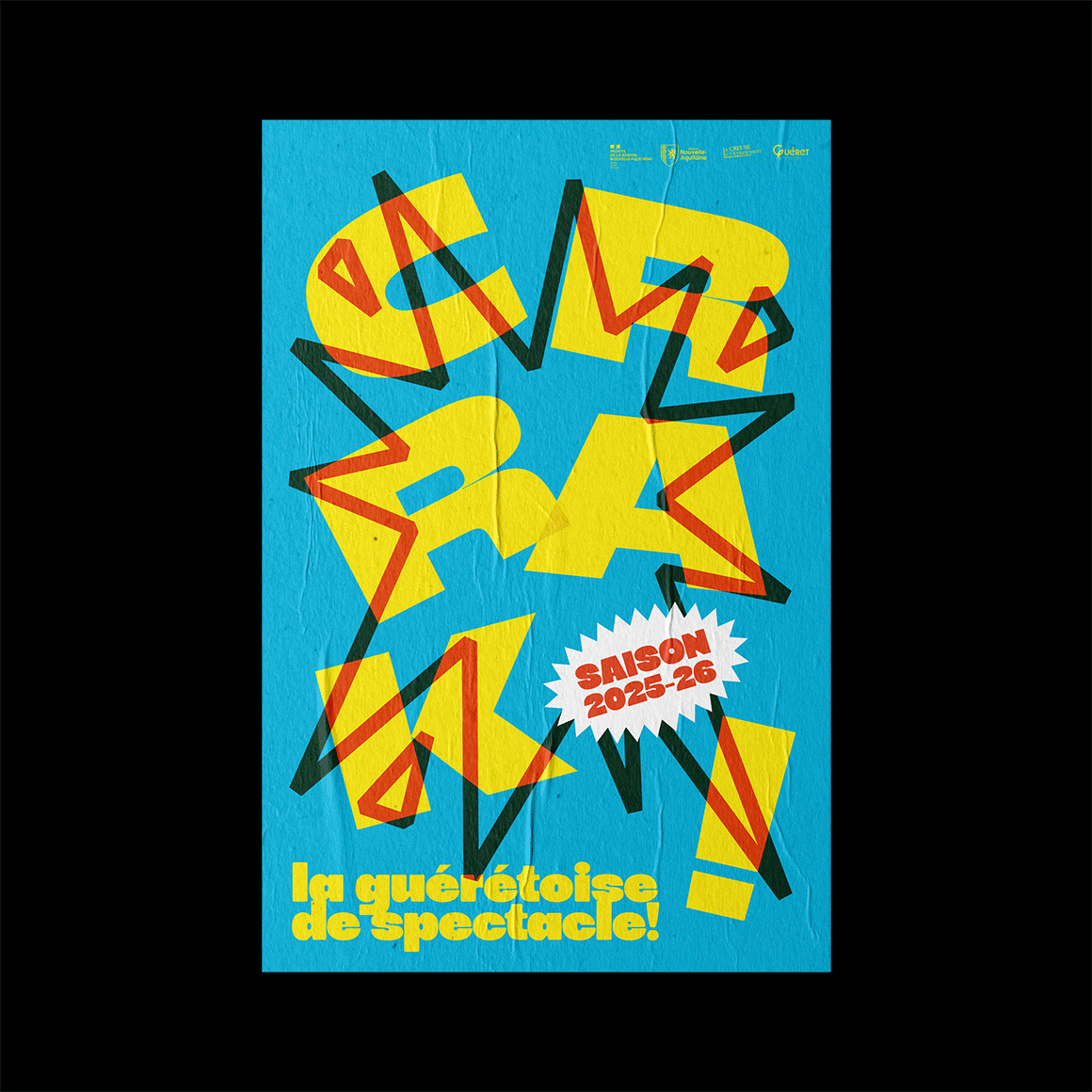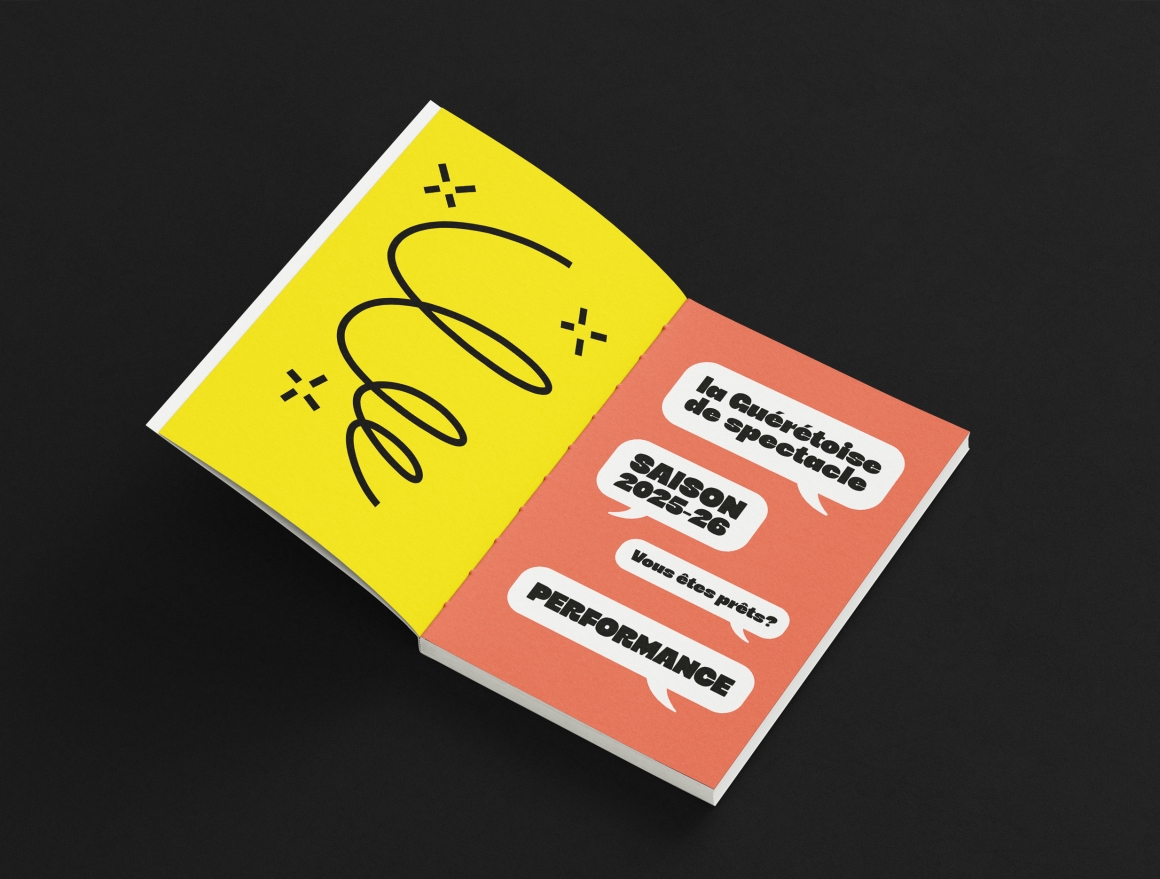 Pour la saison 2025-26 La Guérétoise de spectacle met en avant la notion de performance artistique à travers les spectacles qu’elle propose. Je décide donc de créer une identité qui s’inspire des codes universels de la bande-dessinée pour évoquer les notions de mouvement, d’action, de surprise. Les onomatopées jouent comme une interpellation pour susciter la curiosité auprès du public.