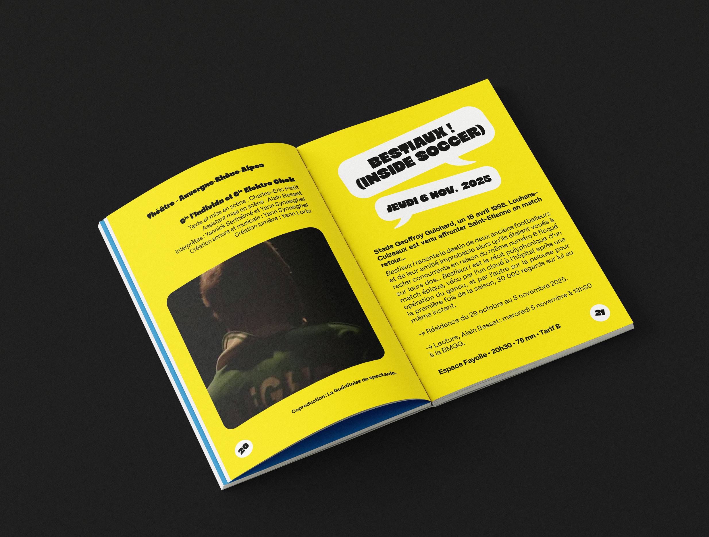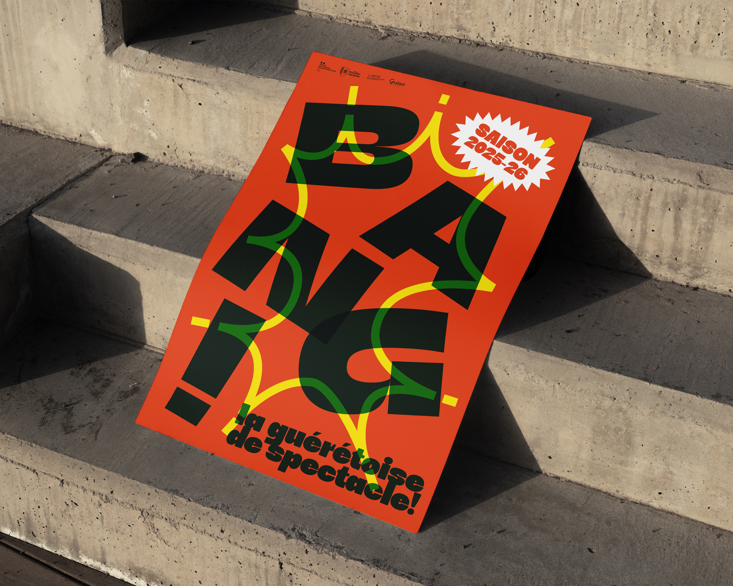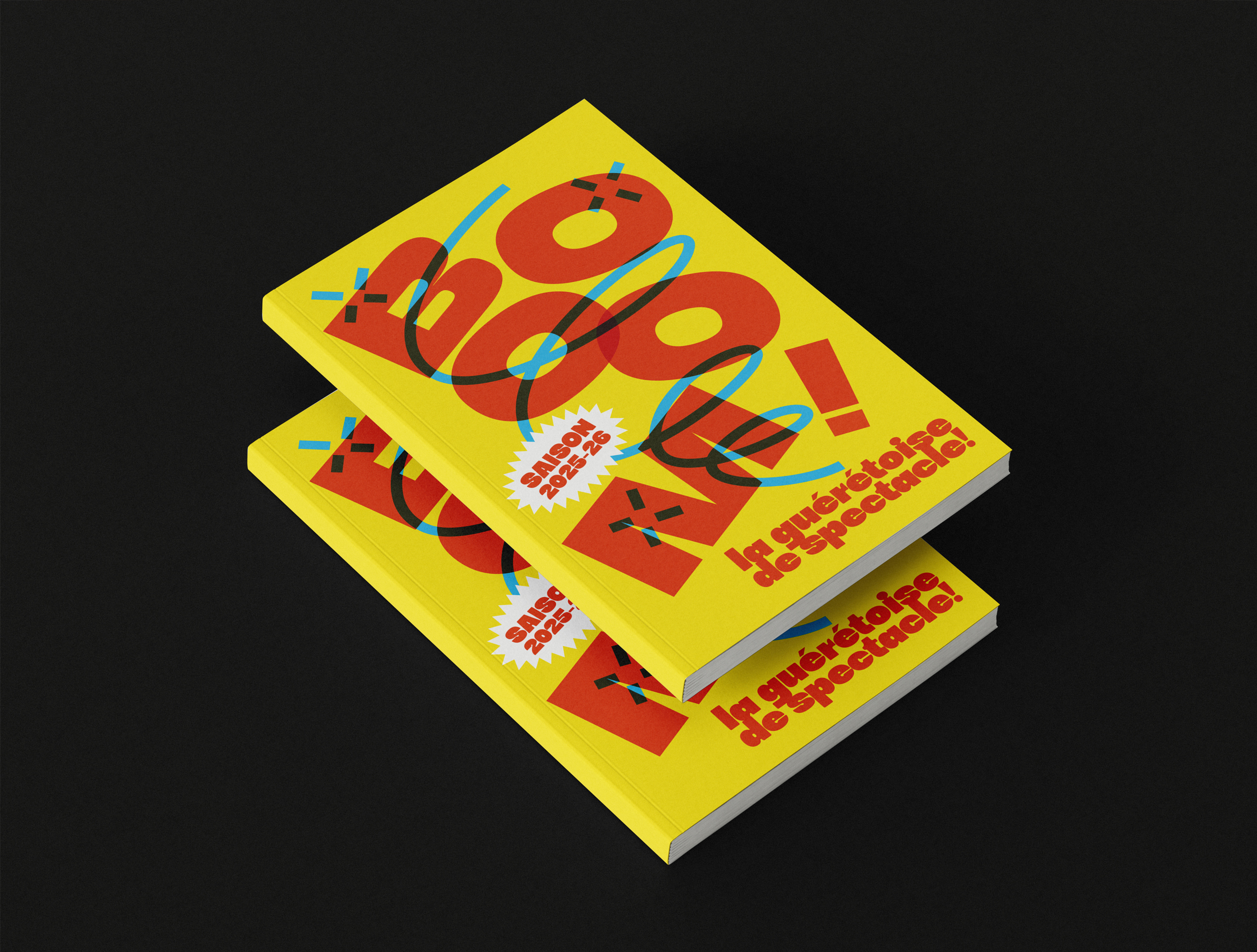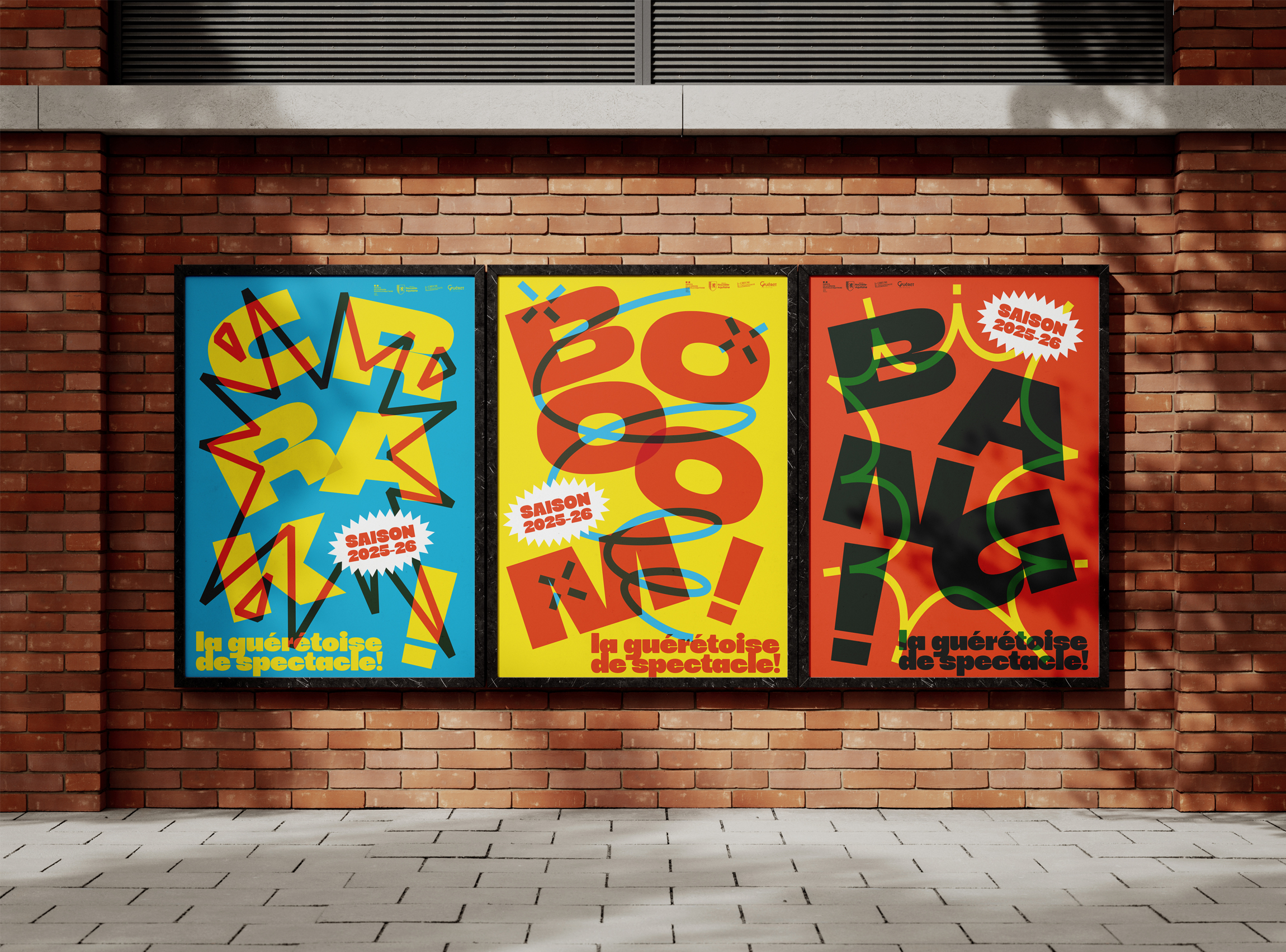 Pour la saison 2025-26 La Guérétoise de spectacle met en avant la notion de performance artistique à travers les spectacles qu’elle propose. Je décide donc de créer une identité qui s’inspire des codes universels de la bande-dessinée pour évoquer les notions de mouvement, d’action, de surprise. Les onomatopées jouent comme une interpellation pour susciter la curiosité auprès du public.